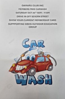 CAR WASH: We have a car wash available for financial members this Saturday 25th October for 9-11am, please present your card to have your car washed. Oamaru Club supporting WBHS Outdoor Education Group